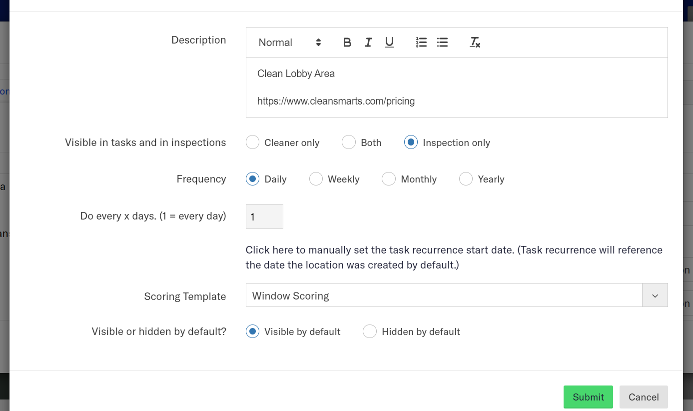The task settings will appear. Under "Visible in tasks and in inspections", select "Cleaner only", "Both", or "Inspection only". Click Submit to save the change.