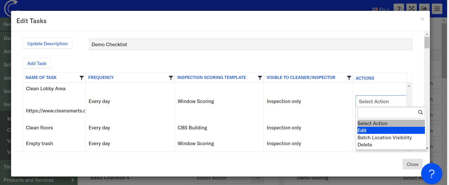 In Clean Smarts, the checklist of tasks you attach to a location is the same checklist that inspectors use as they perform their inspections. This is by design: we believe that having your cleaners' tasks correspond with inspectors' evaluations means there's better accountability. However, you might want to capture information that may only be relevant to the inspection or you might want inspection items that are more detailed than what you provide in your checklist to cleaners. The opposite may be true as well—you may want to add tasks to your cleaner's checklist that do not apply to the inspection.