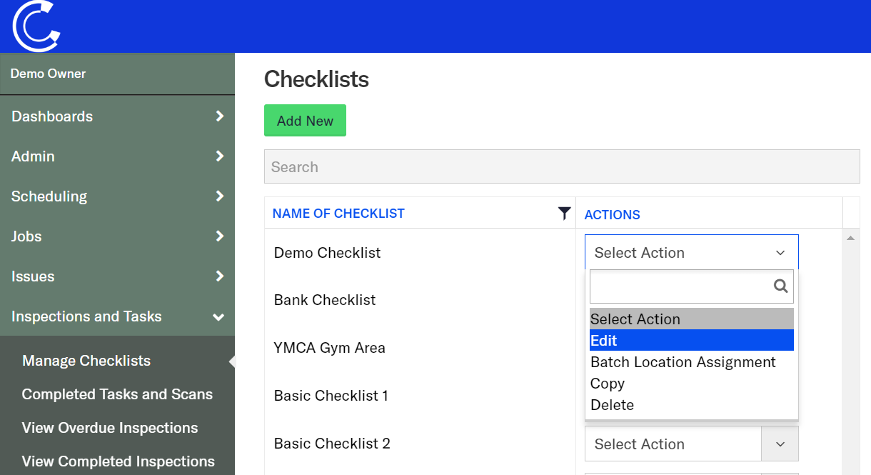 - Go to Inspections and Tasks and then Manage Checklists in the web app menu.
