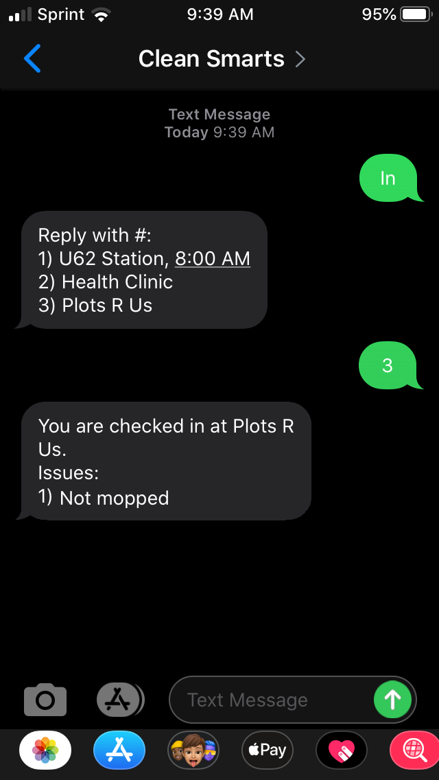 With Clean Smarts, you can clock in and out by texting a toll-free number. This feature is enabled by default and is available to all Clean Smarts customers in the U.S. and the U.K.