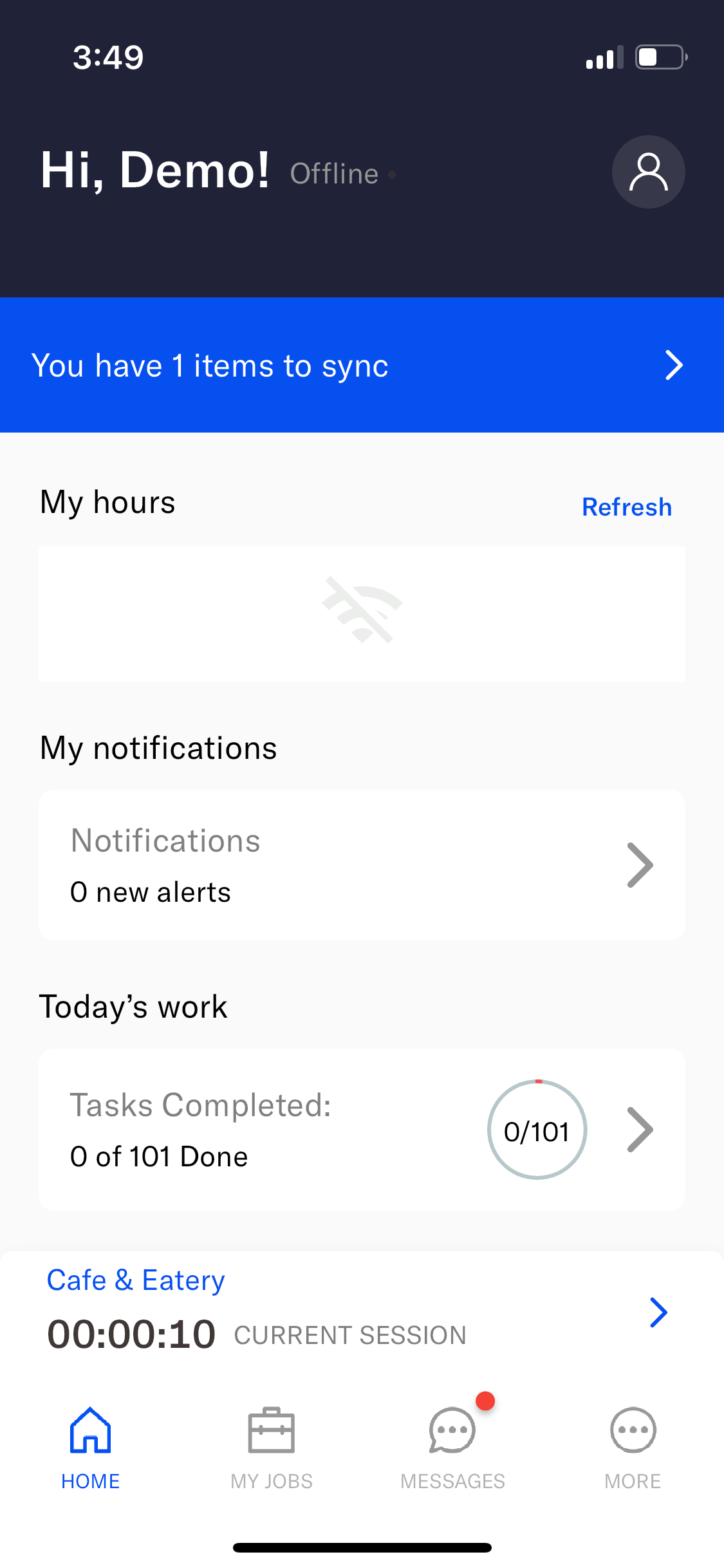 Employees can confirm that they have offline data that needs to be synced by going to the Home screen on the mobile app and looking for a blue banner at the top. To sync data, just reconnect to Wi-Fi or a cellular network. The app detects changes in connection and will upload the data automatically.